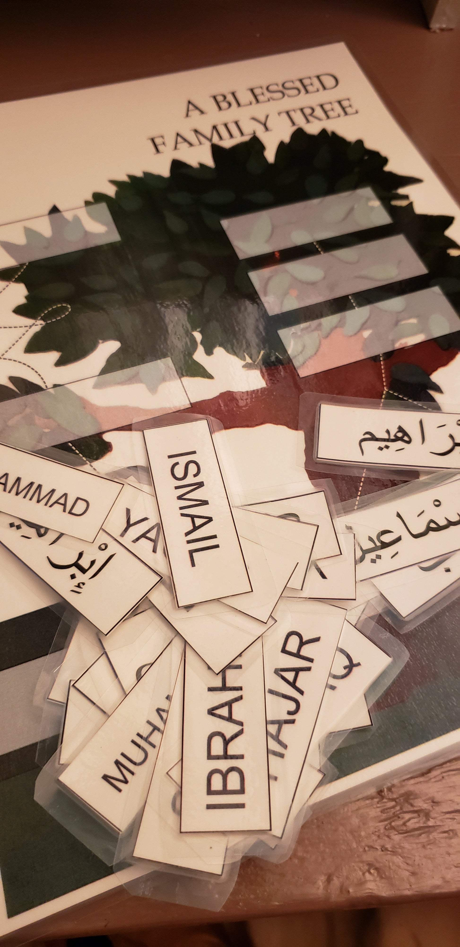 Students learn in English and Arabic the names of the lineage of the Prophets in Rasul Allah's family tree! Velcro allows the name parts to stick to the tree, and the challenge is to place the names in the correct spaces.